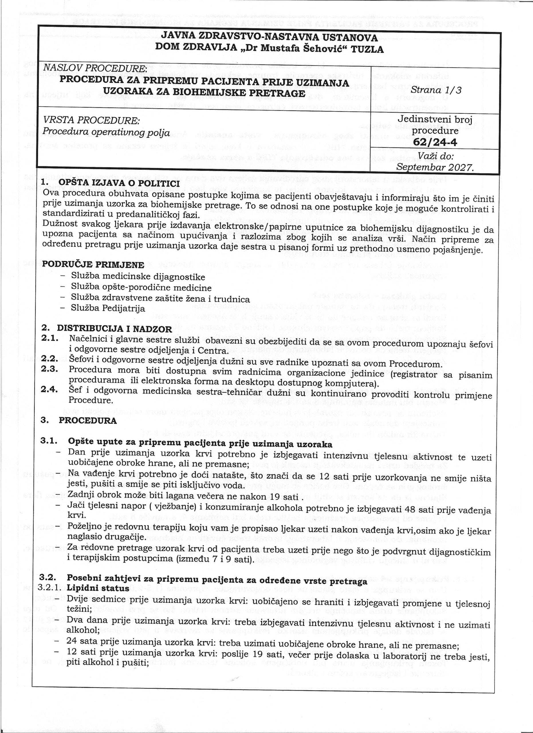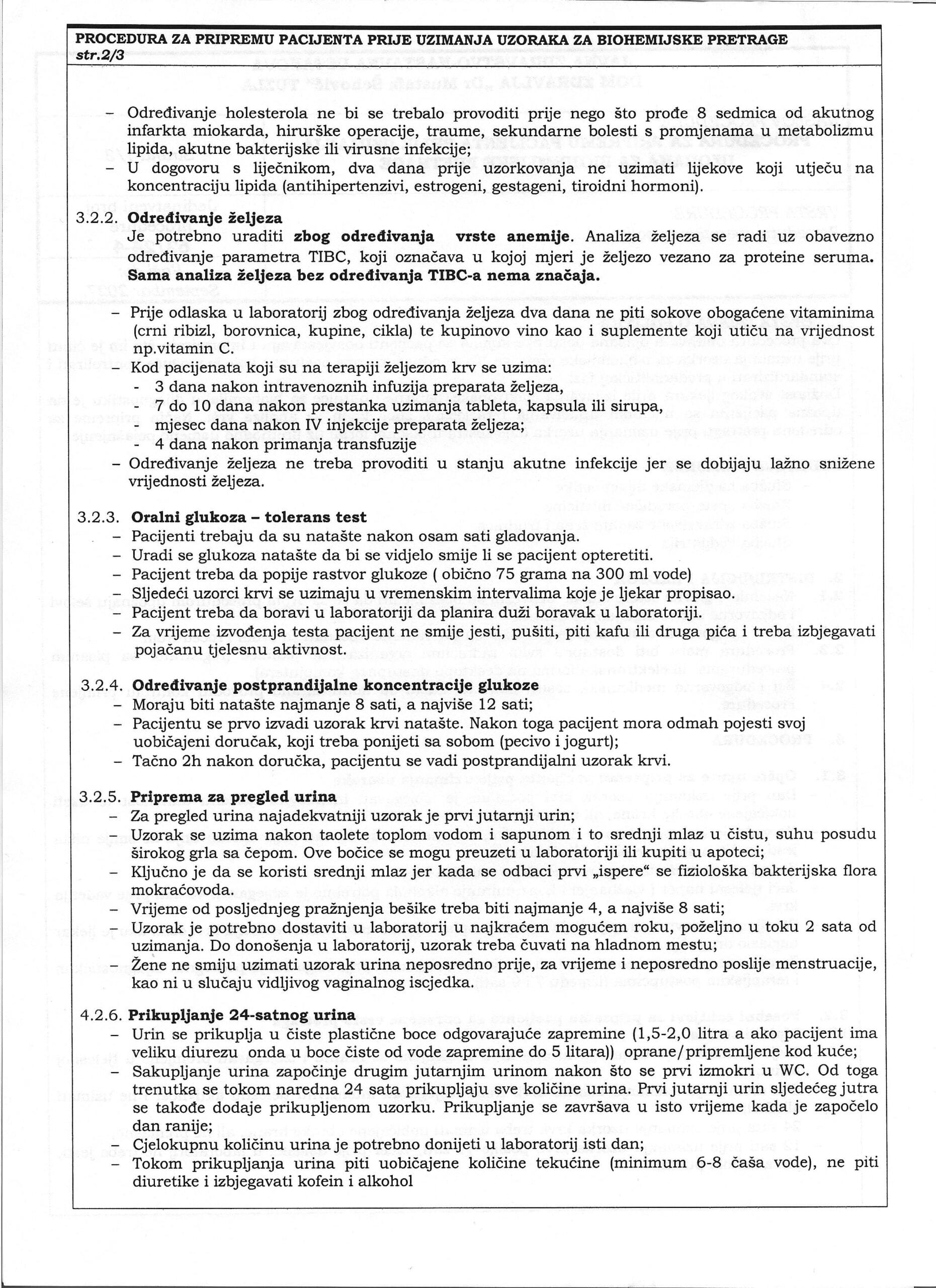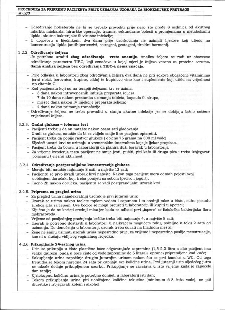 Opširnije na uputama ispod teksta. Osnovna preporuka je da se hrana ne konzumira najmanje 12 sati prije vađenja laboratorijskih nalaza. Radno vrijeme Biohemijskog laboratorija je od 07.00 – 19 radnima danima i subota i nedjelja (HITNI SLUČAJEVI) od 07.00 – 16.00 sati. Uputnice dolaze od Vaših porodičnih ljekara elektronskim putem, nalazi takođe po završetku obrade idu nazad elektronski Vašem ljekaru a ukoliko Vam lično treba štampani nalaz možete ga dobiti isti dan iza 13.30 sati ili najsigurnije sutradan iza 10.00 sati na šalteru Biohemijskog laboratorija.