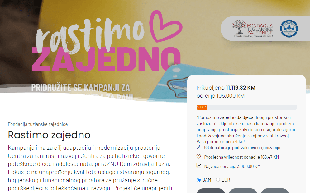 Projekat “Rastimo zajedno” je inicijativa koja je pokrenuta sa Fondacijom Tuzlanske zajednice s ciljem adaptacije prostora Centra za rani rast i razvoj i Centra za psihofizičke i govorne poteškoće Doma zdravlja Tuzla. Ovaj projekat je izuzetno važan jer omogućava poboljšanje uslova u kojima djeca, u najosetljivijem periodu svog razvoja, mogu dobiti potrebnu podršku i pomoć.